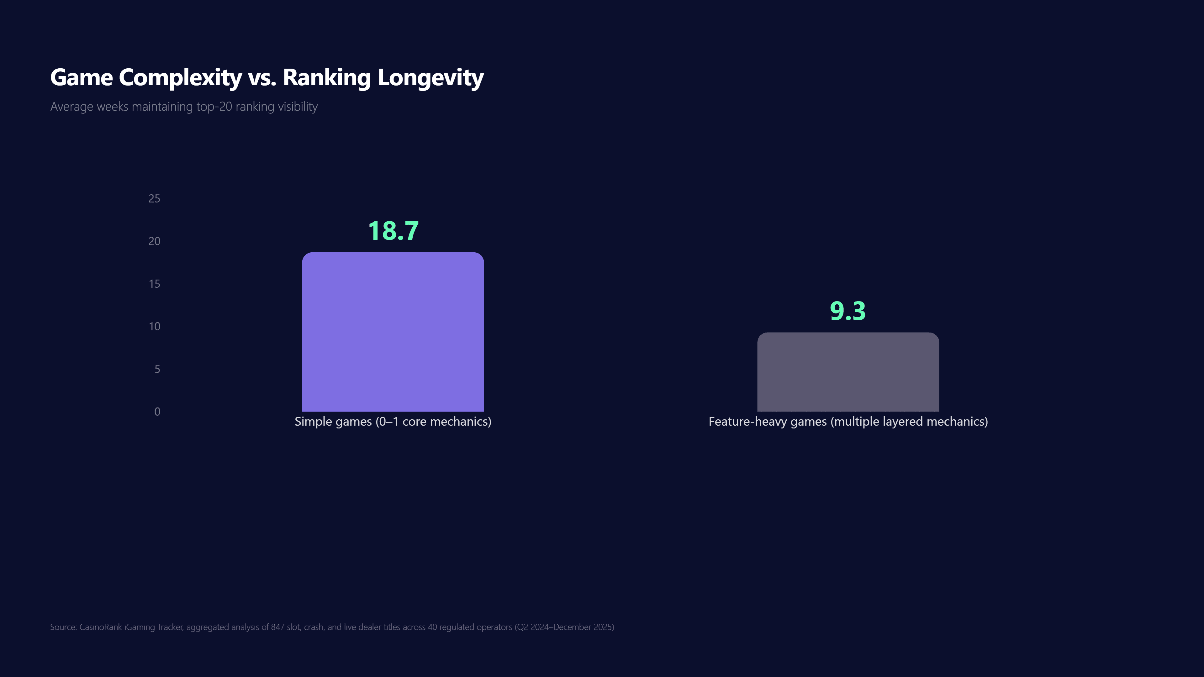 This chart compares how long simple and feature-heavy games remain visible in the top-20 rankings. Games with fewer mechanics maintain ranking positions for significantly longer periods.